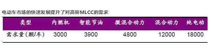 通信頻段大幅增加將帶來超小型MLCC的需求增量。相比目前滿足LTE標準的手機需要的300-500 顆貼片電容 ,到滿足LTE-advanced標準的手機需550-900顆,單機MLCC用量將提升80%以上。電動車市場的快速發展提升了對高容MLCC的需求。燃油車不需要使用MLCC,而純電動車需要使用大約18000個高容MLCC。